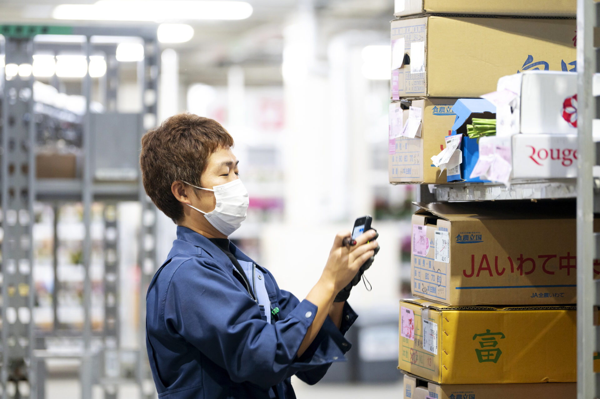 場内では、搬入される商品を整理して、台車毎に並べたり積載の処理をして販売準備をし、セリ人として販売をしています。