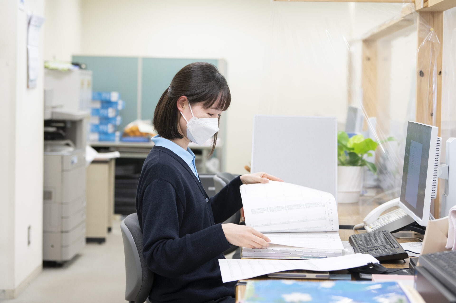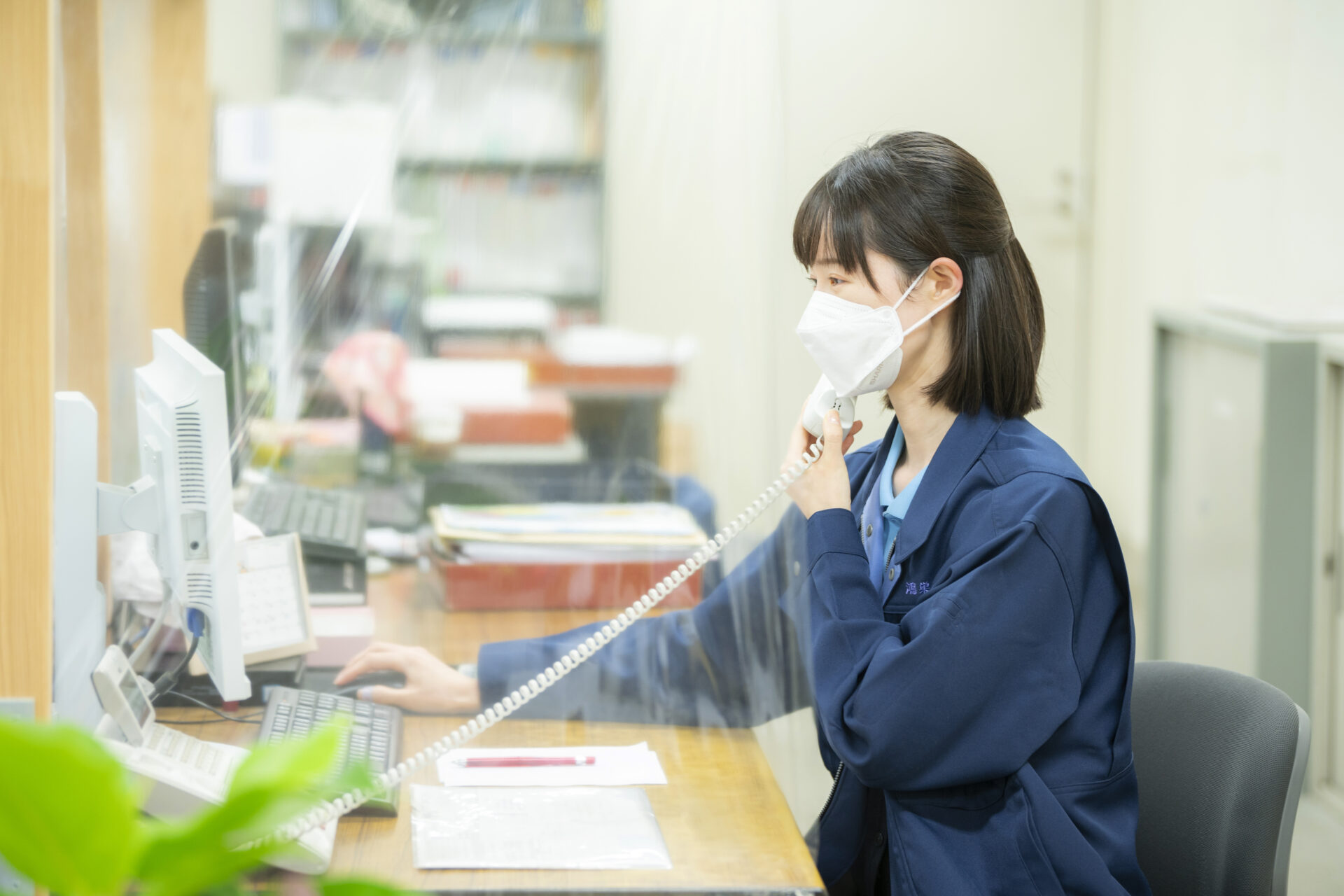 デスクワークでは、代表番号にかかってくる電話への対応や窓口でのお客様対応、社内・社外の書類整理をします。 -